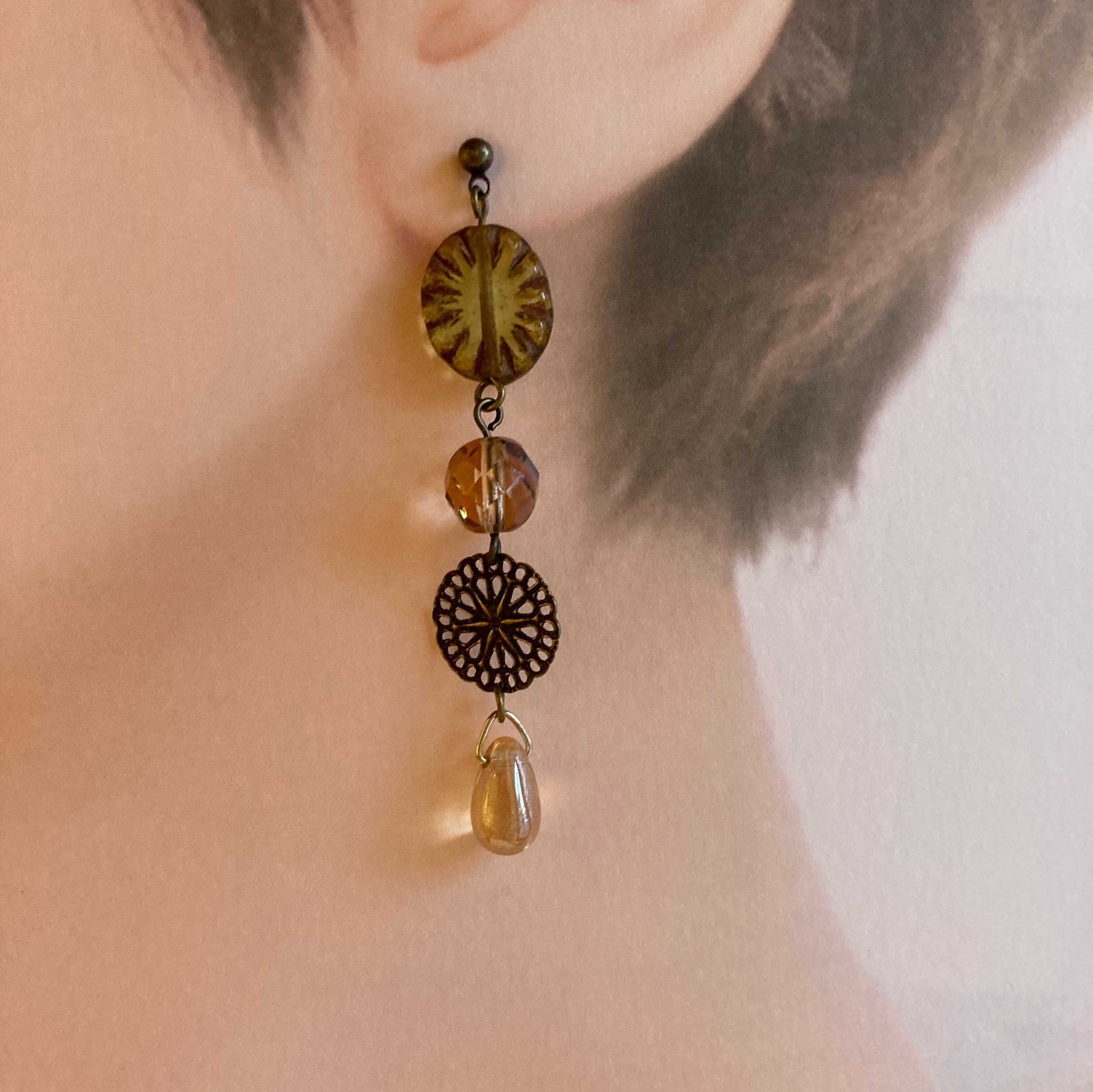 チェコビーズに金古美のメタルパーツを合わせたロングピアス