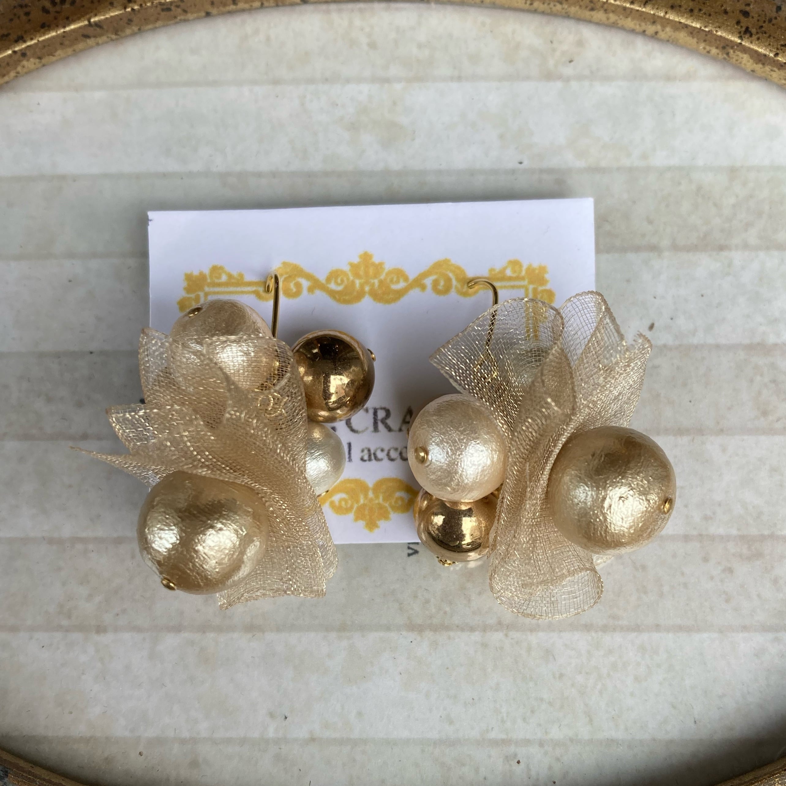 ベージュ系コットンパールにシフォンリボンを挟みゴールドビーズを合わせました